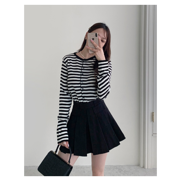 탄탄한 짜임의 배색 스트라이프 U넥 가디건